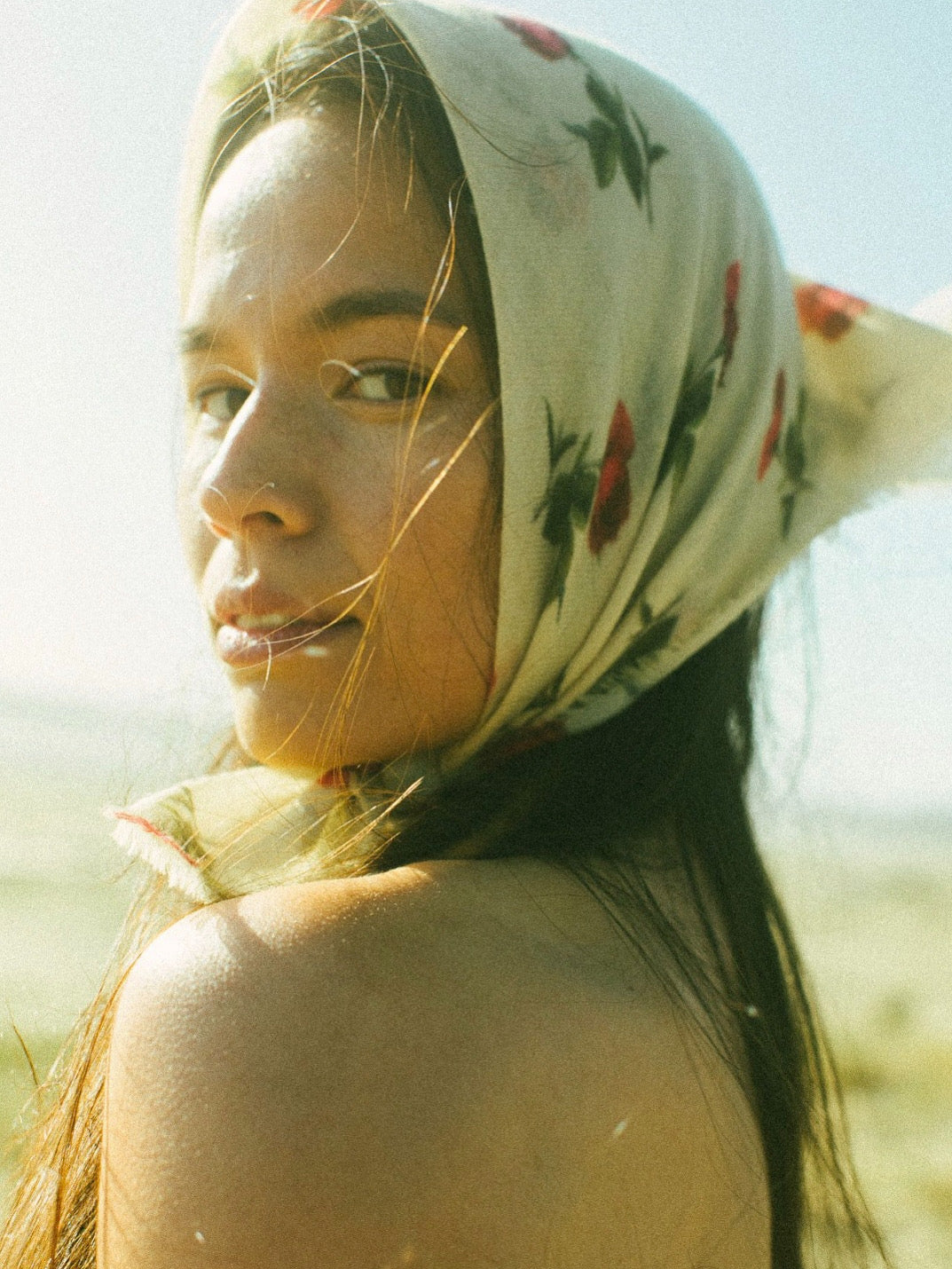Buttery soft 100% cashmere bandana in rose bud print.