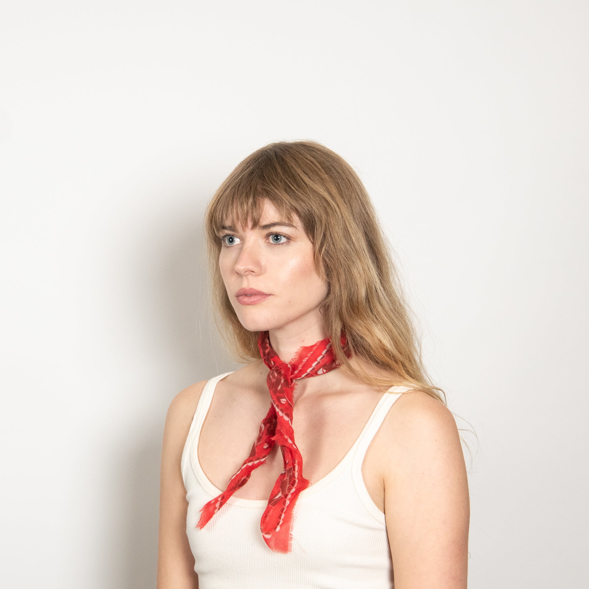 Buttery soft 100% cashmere bandana in a red dot print.